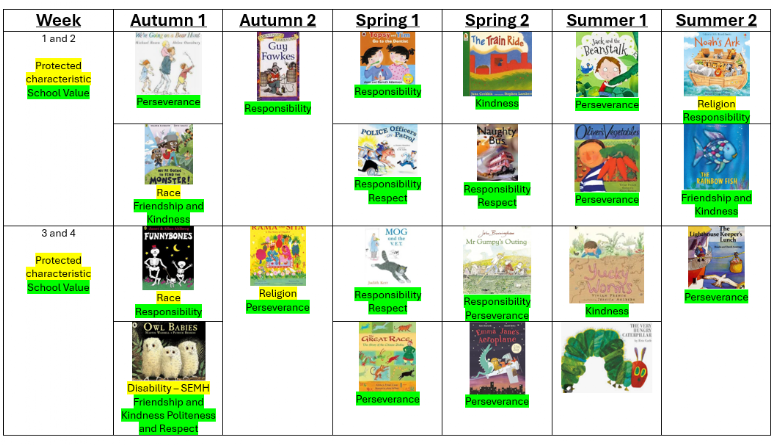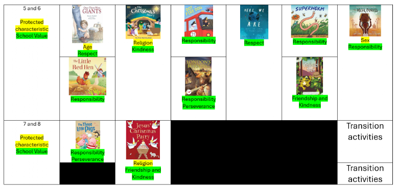 Below is an overview of the books we explore along with their alignment to the protected characteristics and our school values.
